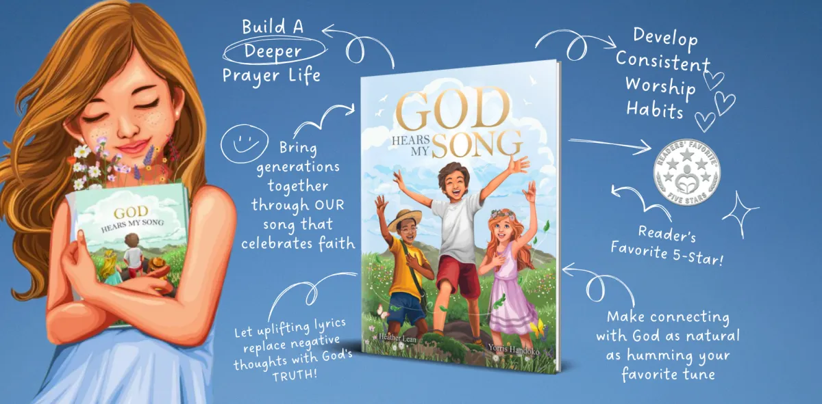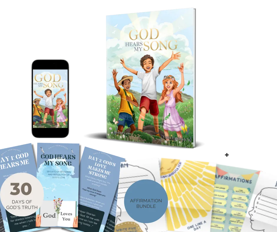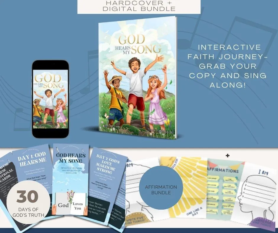 You’ll receive the hardcover God Hears My Song book (shipped to your door), the exclusive sing-along video, and a free digital/eBook version for instant access. You’ll also get bonus resources: a 30 Days of God’s Truth devotional, printable gratitude journal, angel paper dolls activity set, calligraphy song lyrics, a 30-day email devotional, plus inspirational phone wallpapers and prayer cards—all included.